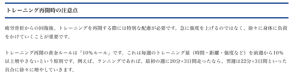 幸い、疲労骨折時の痛みとは全然違う緩やかな痛みなので再骨折はまぬがれたと思うのですが、練習再開での強度の進め方が甘かったと反省してます。